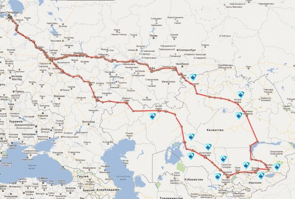 Маршрут пролегал через такие города как: Костанай-Астана-Караганда-Балхаш-Алматы-Бишкек-Тараз-Шимкент-Туркестан-Кызылорда-Байконур-Аральск-Актобе.